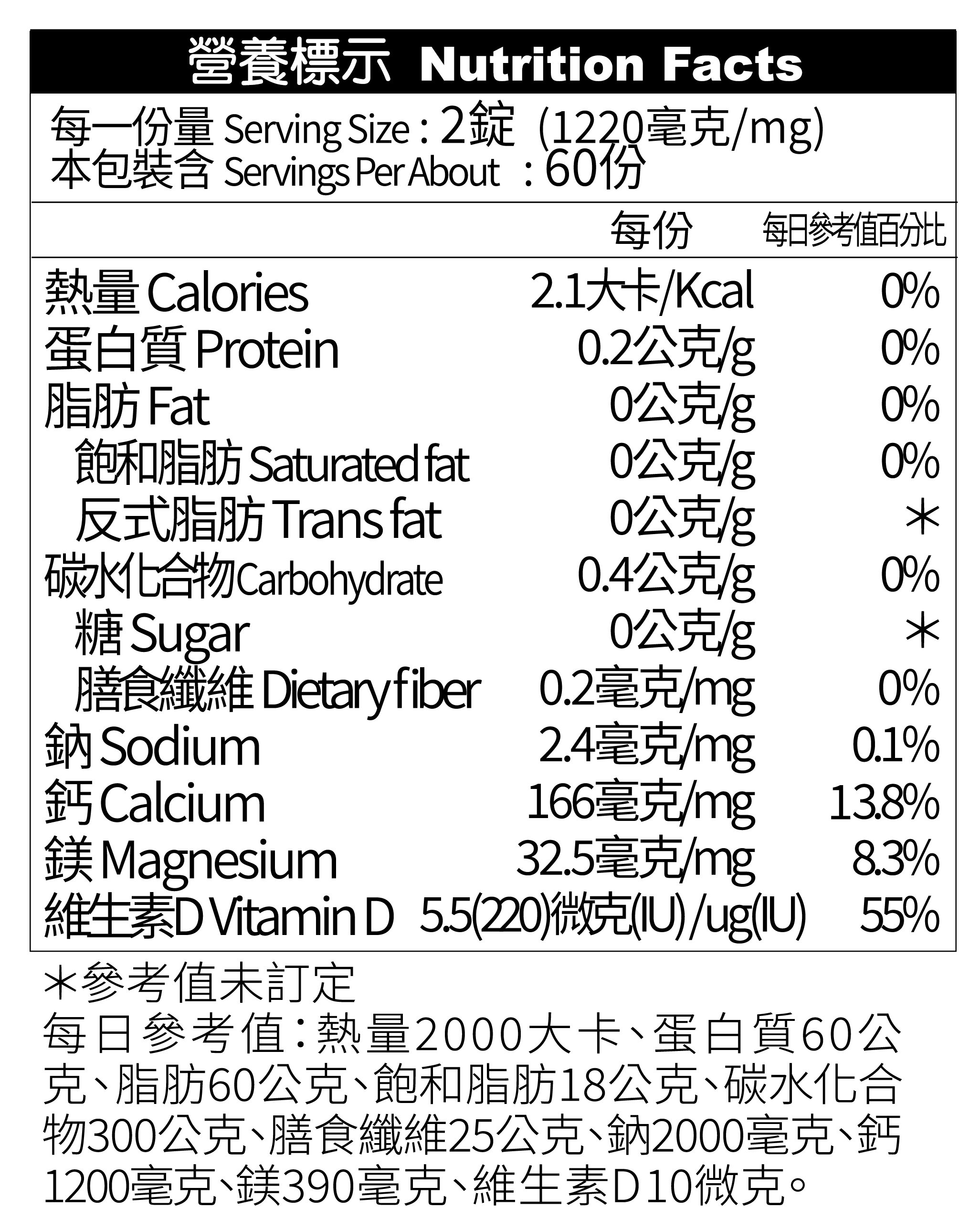成分 : 碳酸鈣(海藻鈣)、鎂酵母、麥芽糊精、豌豆纖維、酵母粉(含維生素D2)