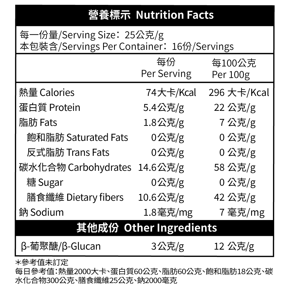 | 食用建議 | 1. 取25g加入200c.c.熱水沖泡,亦可加入豆漿、果汁中飲用。 2. 煮粥時加入取代部分白米。 3. 製作麵食、烘焙糕點時加入,增加纖維攝取。 |