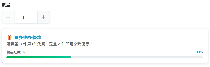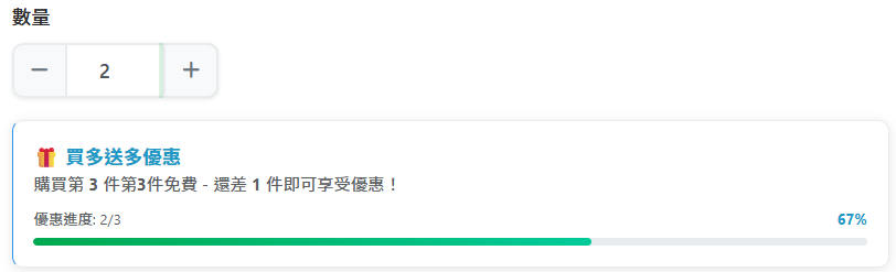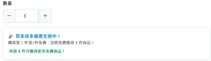 購買三件時,系統會顯示優惠生效中,你將免費獲得一件商品