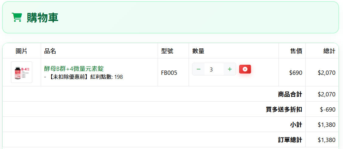 在購物車的頁面,可以清楚的看見,買多送多折扣生效中,折扣690元,第三件的價錢已經折扣。
