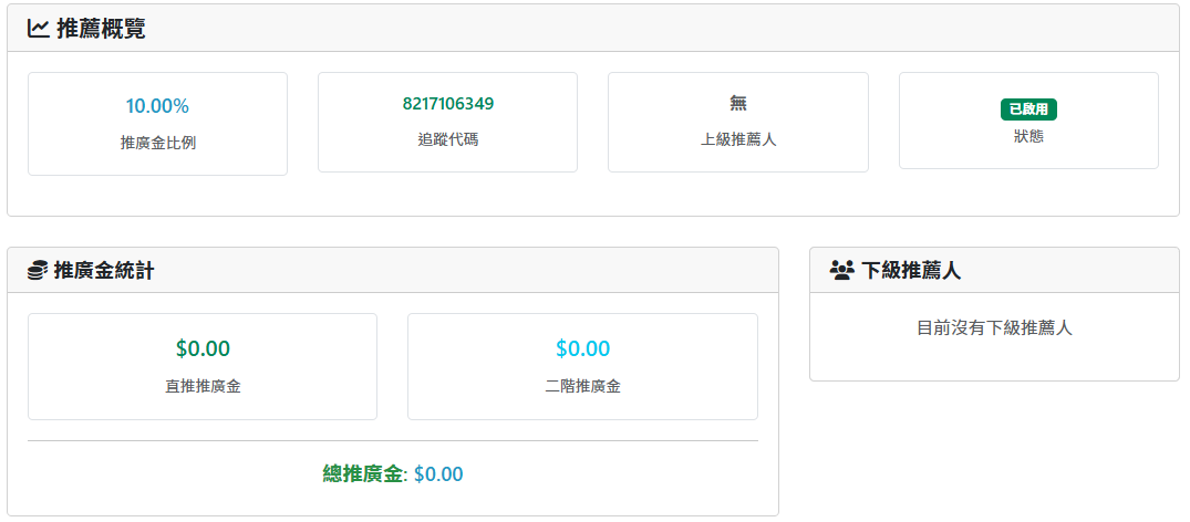 獲取推廣連結成功申請後,您可以在會員中心-推薦帳號獲得專屬的推廣連結或推薦碼,用於追蹤您的推廣成效。