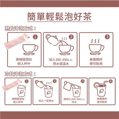 食用方式:以300-350c.c.熱水、溫水或冰水沖泡,水量可依個人喜好調整。
