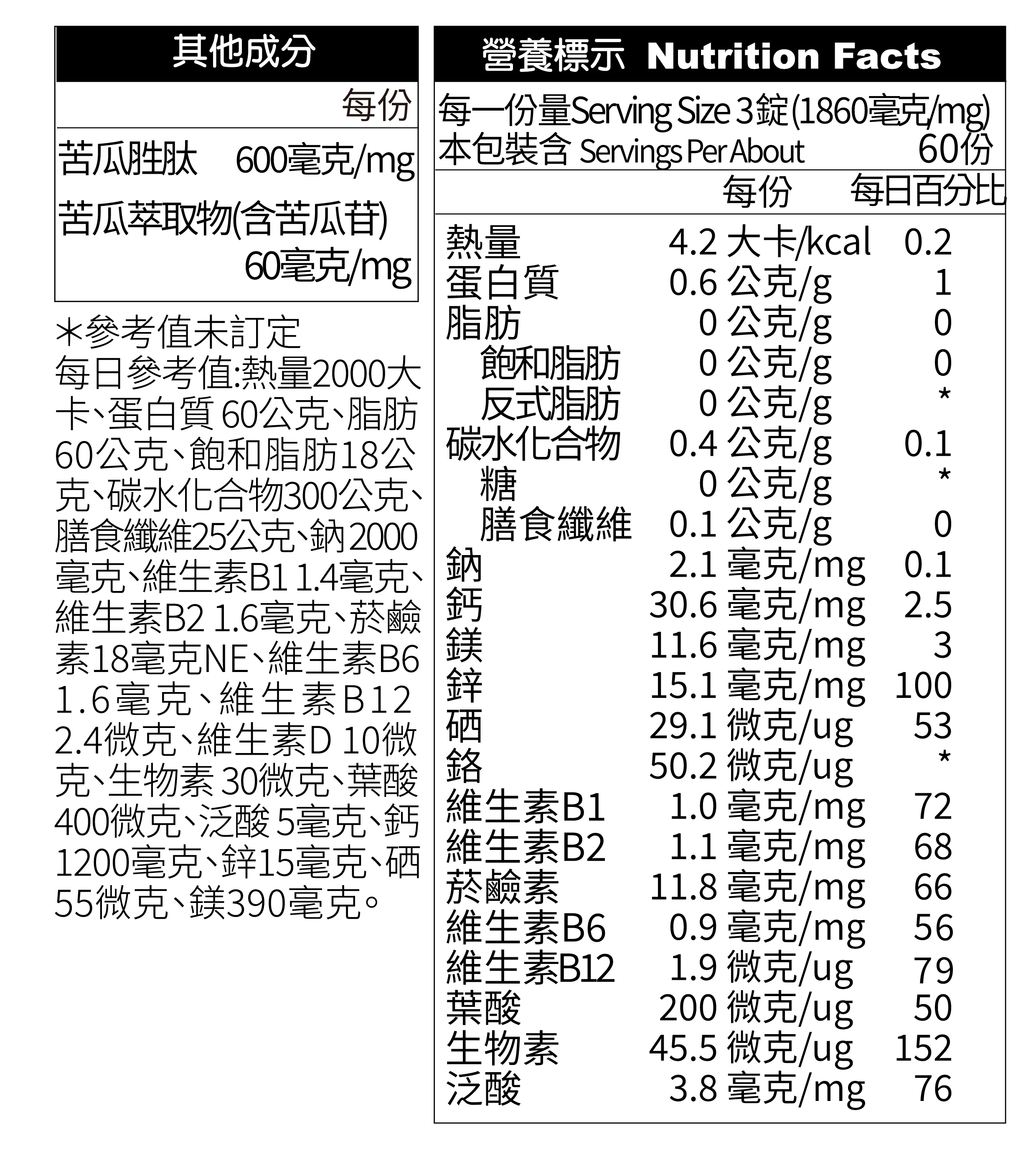 成分:苦瓜胜肽、苦瓜萃取物(含苦瓜苷)、鎂酵母、硬脂酸鎂、酵母粉(含維生素B群)、碳酸鈣(紅藻鈣)、鋅酵母、二氧化矽、鉻酵母、大豆胜肽、小麥胜肽、豌豆胜肽、玉米胜肽、硒酵母