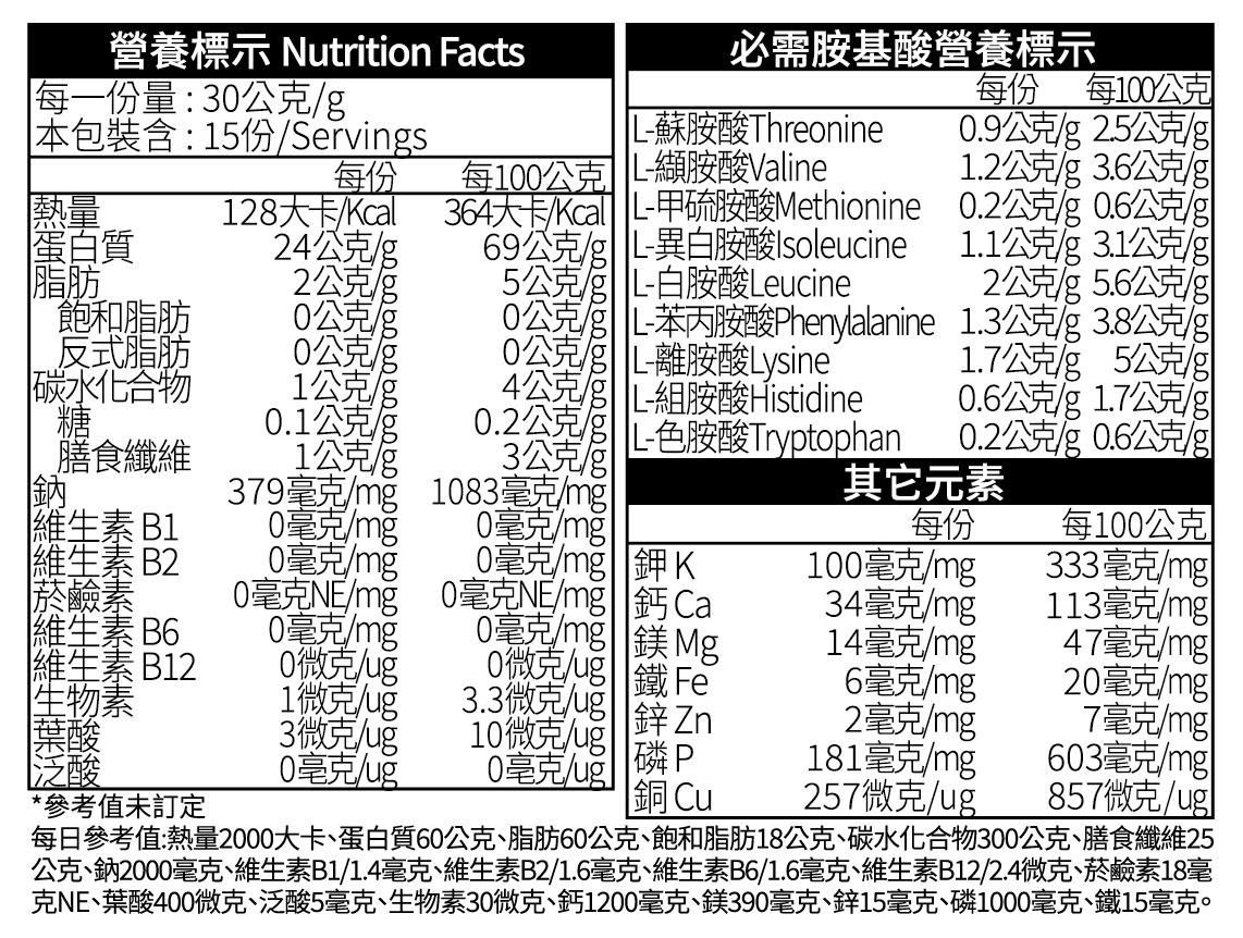 成份:豌豆分離蛋白粉、黃豆漿粉、酵母蛋白粉