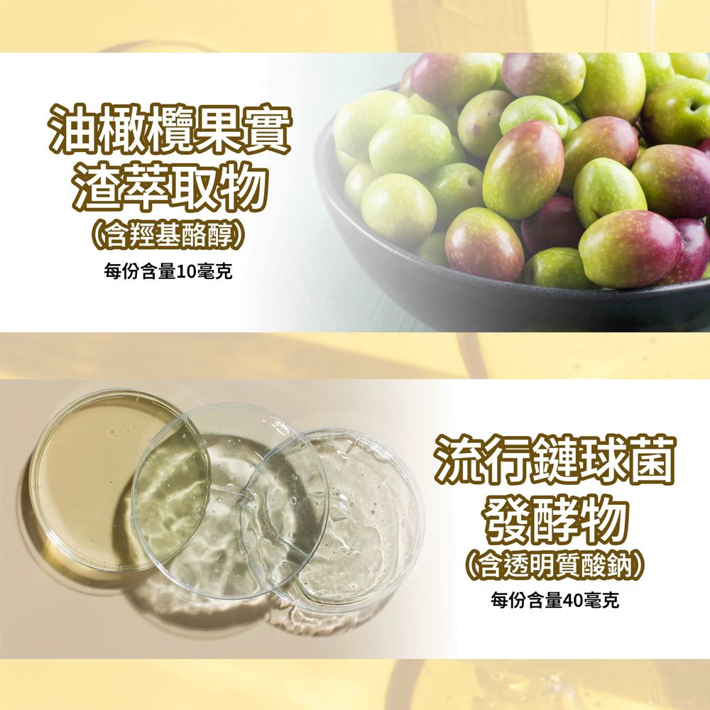 - ✔️ 橄欖苦苷50毫克/份 ✔️蝦紅素3毫克/份 ✔️流行鏈球菌發酵物(含透明質酸鈉)40毫克/份