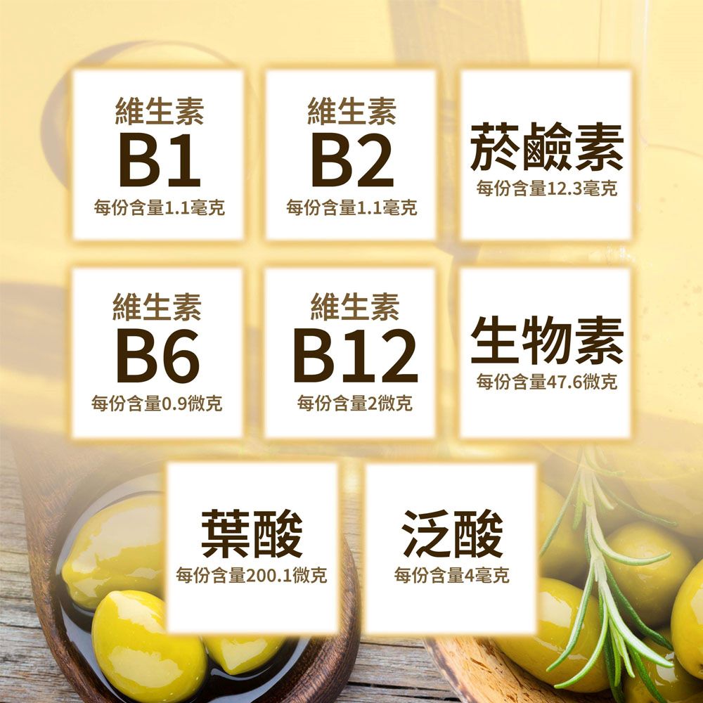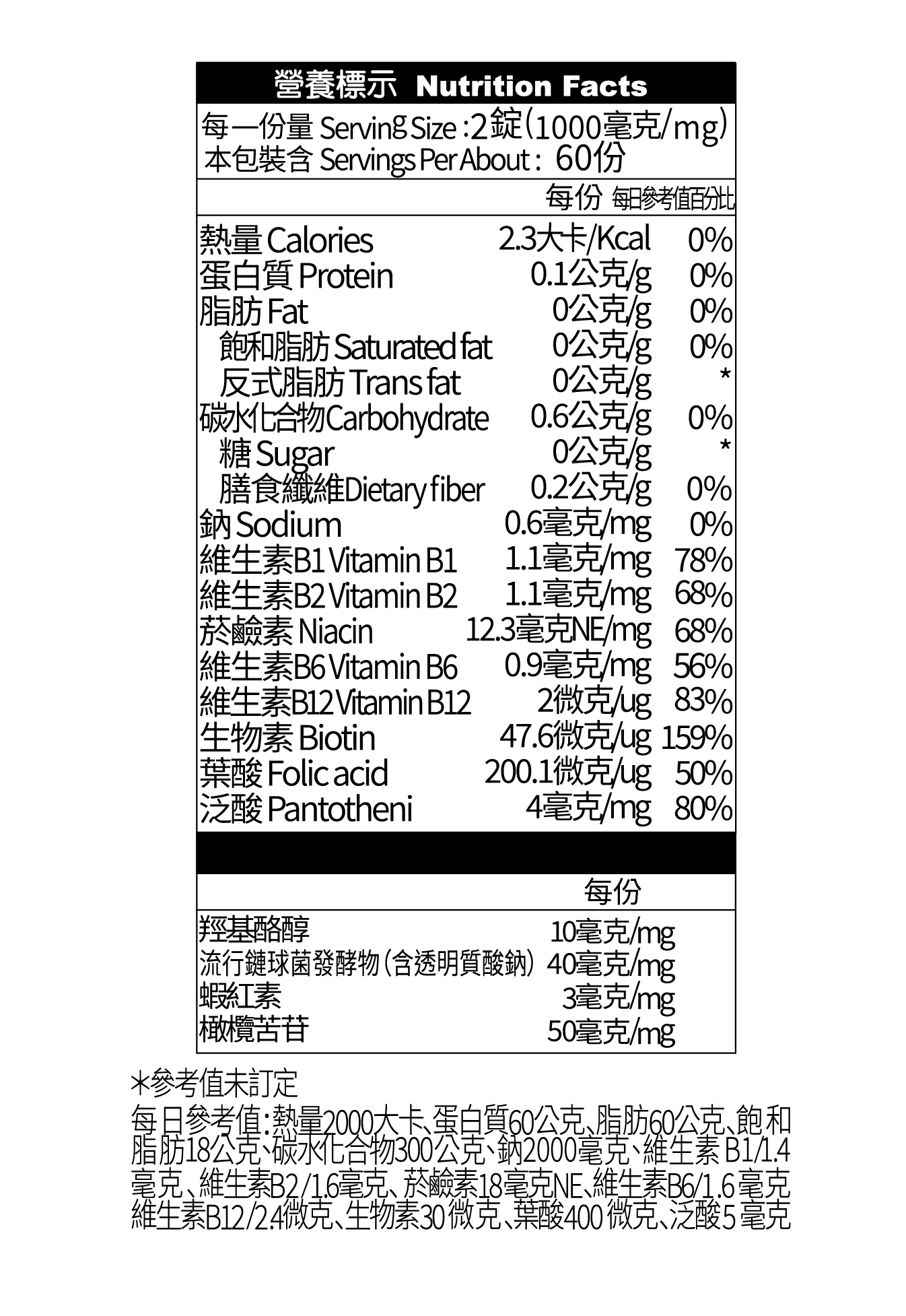 成分:麥芽糊精、豌豆纖維、橄欖苦苷、酵母粉(含維生素B群)、紅藻萃取物(含蝦紅素)、油橄欖果實渣萃取物(含羥基酪醇)、硬脂酸鎂、流行鏈球菌發酵物(含透明質酸鈉)、二氧化矽