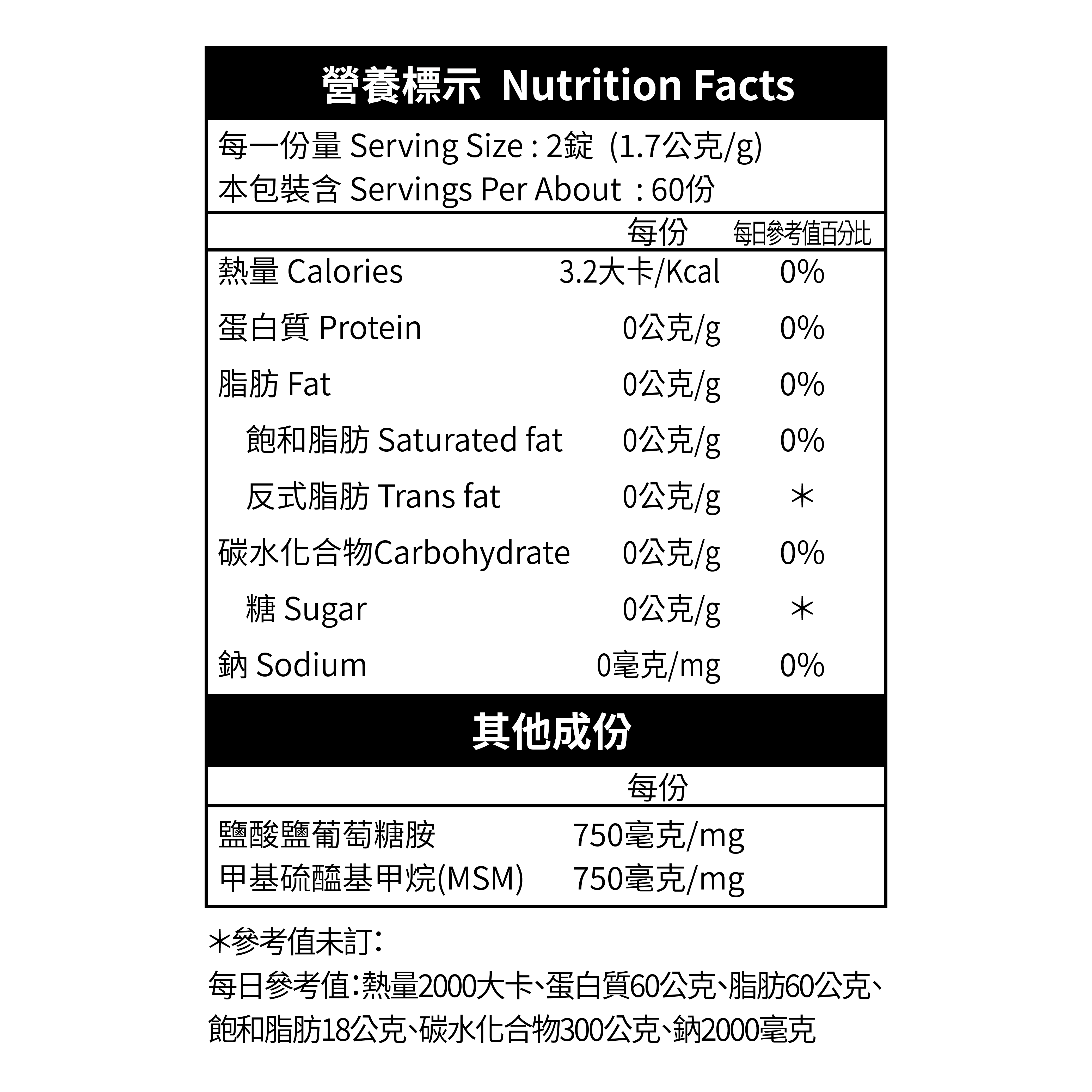 成份: 鹽酸鹽葡萄糖胺、甲基硫醯基甲烷(MSM)、麥芽糊精