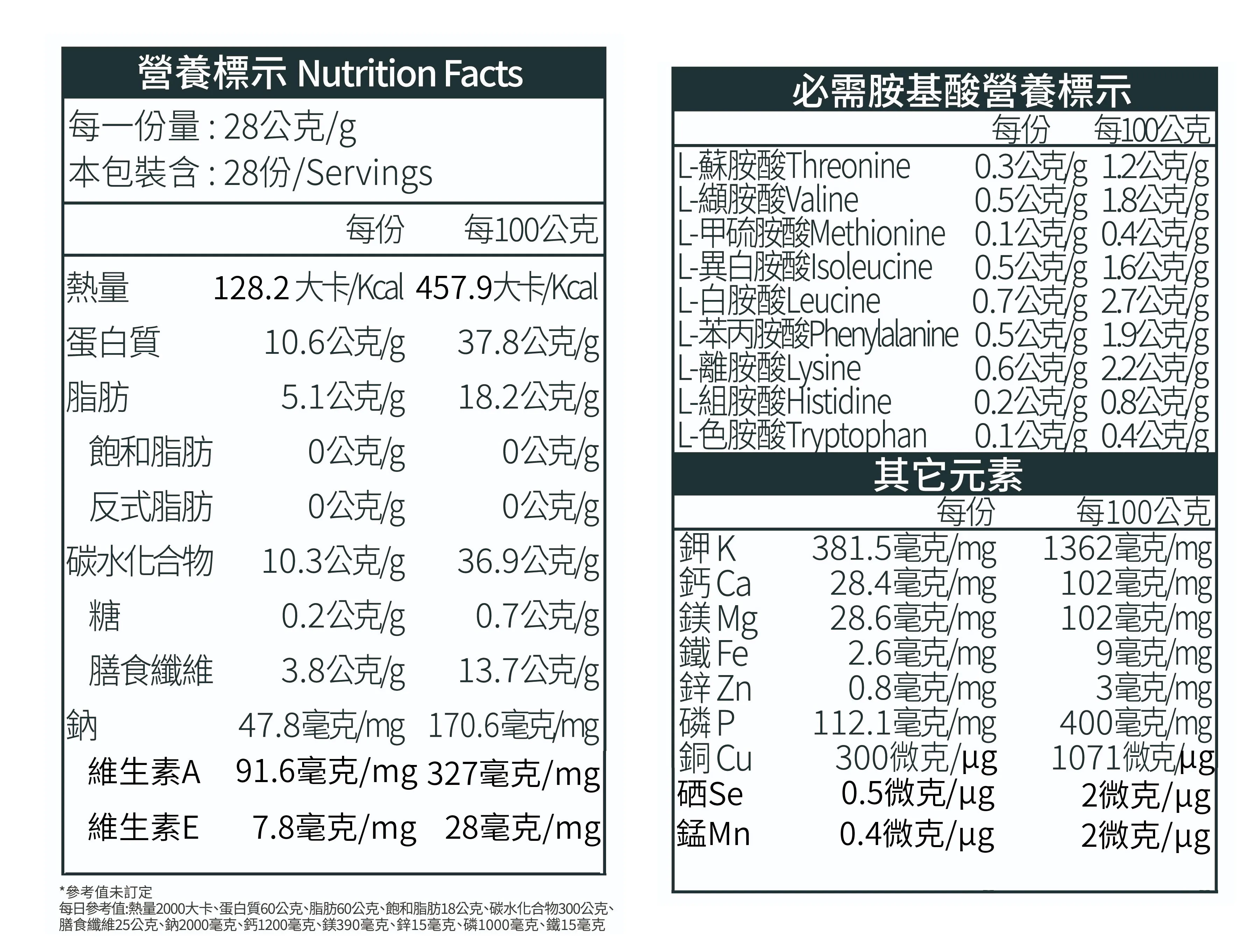 - ✔️ 膳食纖維每份4公克 ✔️蛋白質10.6公克/份