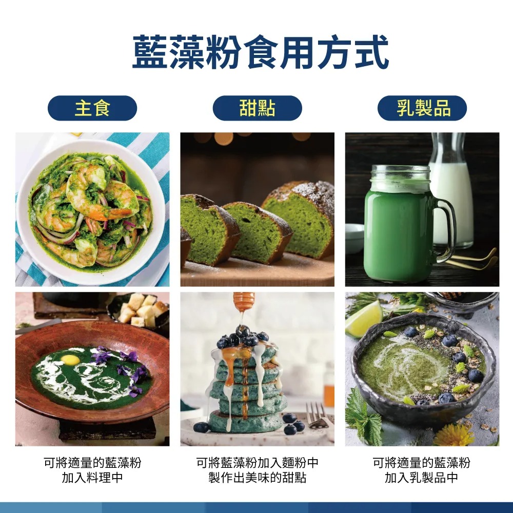 食用方式:可將適量的藍藻粉加入料理中(如主食、甜點、乳製品等),或直接以溫開水沖泡飲用,建議每日2-4公克