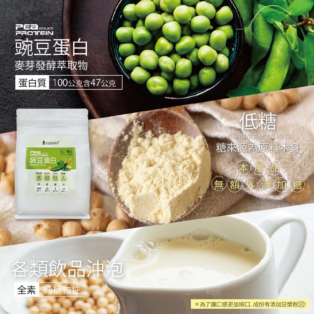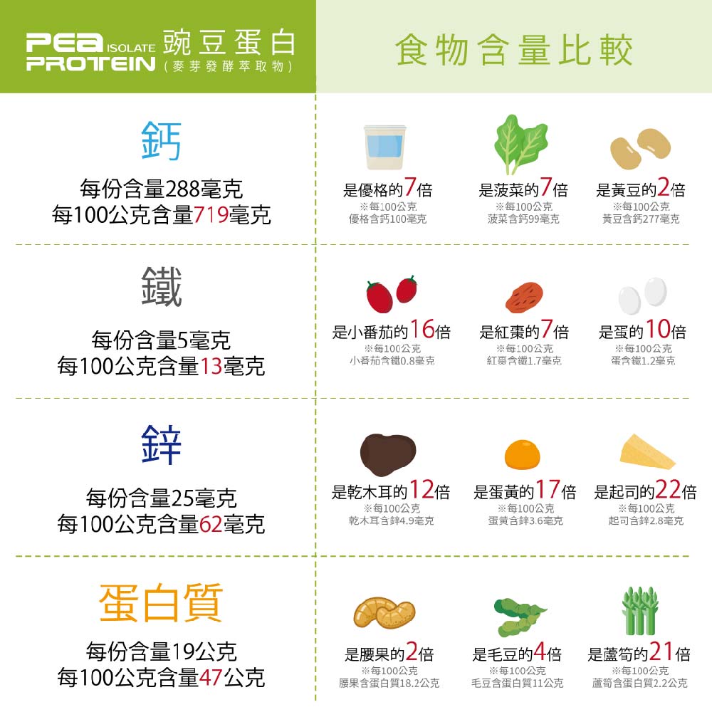 成分:豌豆分離蛋白粉、麥芽發酵萃取物、豌豆纖維、豆漿粉、碳酸鈣(奈米鈣)、關華豆膠